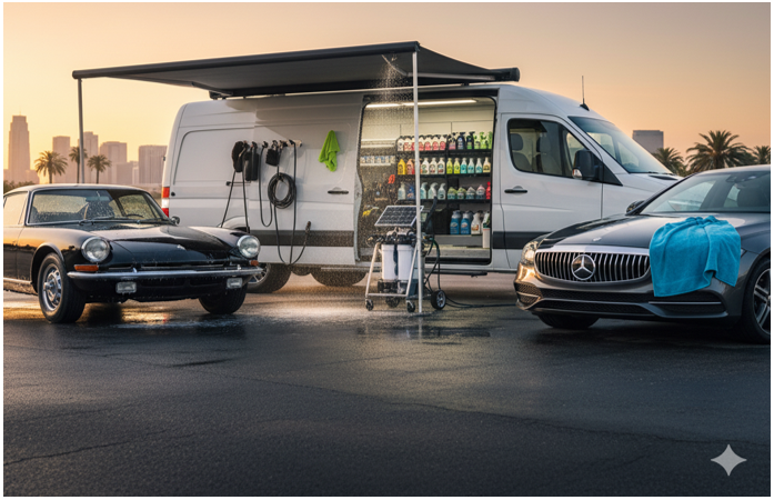 بإمكانك أن تقدم خدمة غسيل السيارات في الأماكن العامة، أو مكان العمل، أو المنازل عن طريق بعض المعدات والأدوات المحمولة والمواد الصديقة للبيئة، ويعتبر المشروع من المشاريع المربحة للغاية برأس مال قليل، ومن مزاياه أنه لا يحتاج إلى موقع ثابت.