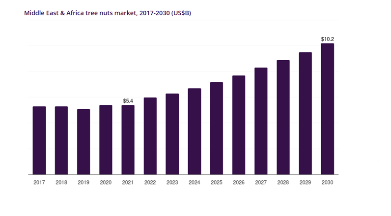 تُظهر التقديرات أن سوق المكسرات في منطقة الشرق الأوسط وأفريقيا يمر بمسار تصاعدي، إذ بلغت قيمته نحو 5.4 مليار دولار أمريكي في عام 2021، مع توقعات بأن يتضاعف حجمه تقريبًا ليصل إلى 10.2 مليار دولار أمريكي بحلول عام 2030، مدفوعًا بمعدل نمو سنوي مركب يقدر بـ 7.3% خلال الفترة ما بين 2022 و2030