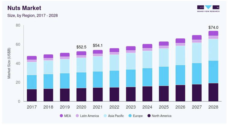 تم تقدير حجم سوق المكسرات العالمي بـ 55.90 مليار دولار أمريكي في عام 2022 وفقًا لبعض الدراسات والتقارير، ومن المتوقع أن يصل إلى 85.15 مليار دولار أمريكي بحلول عام 2030، بمعدل نمو سنوي مركب قدره 5.4% بين عامي 2023 و2030.
