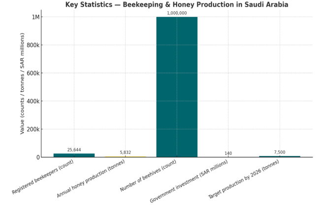 بالإضافة إلى أن عدد خلايا النحل على مدار العام وصل إلى ما يقارب المليون خلية، كما أن الإنتاج السنوي من العسل تخطى 5,832 طن، ولا ننسى حجم الاستثمارات الحكومية السعودية من خلال بعض البرامج التمويلية والتي من أهمها برنامج ” ريف ” لتصل حجم الاستثمارات إلى 140 مليون ريال سعودي.