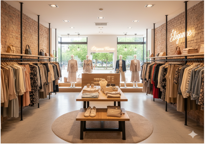- تجهيز المتجر من حيث الأرفف، والشماعات، وتوفير أنظمة نقاط بيع، بجانب الإضاءة والتهوية الجيدة، وتصميم الديكور العام يما يتوافق مع الطابع الأساسي لـ متجر بيع الملابس النسائية.