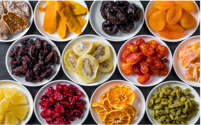 - الفواكه المجففة بمختلف أنواعها (تمر مجفف، تين، عنب، فراولة، مشمش إلخ).
