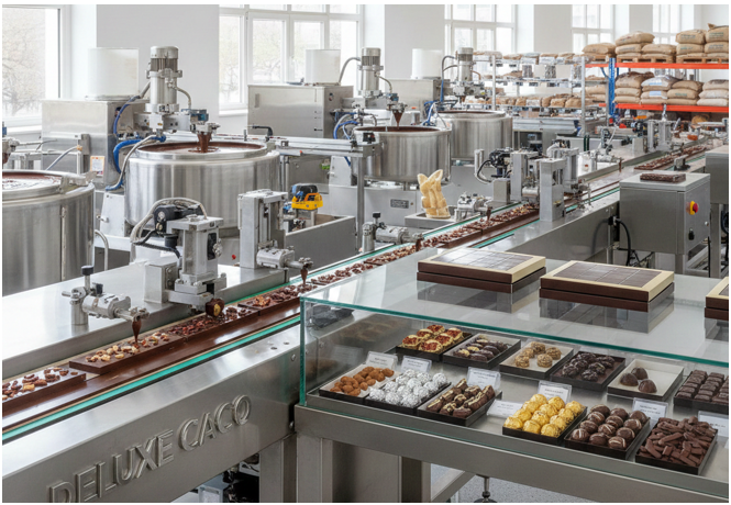 خط إنتاج شيكولاتة وحلويات فاخرة يبدأ من استلام وفحص المواد الخام من الكاكاو والسكر والحليب إلخ، وصولًا إلى مرحلة تحميص الكاكاو والمكسرات للحصول على نكهة مميزة، ومن ثم تأتي مرحلة طحن حبوب الكاكاو وتحويلها إلى معجون ناعم ويتم إضافة مختلف المكونات الأخرى على المعجون من السكر والحليب أثناء عملية الطحن ليتم التجانس جيدًا، وفيما بعد تأتي مرحلة Conching والمقصود بها الخطوة التي يتم فيها عملية العجن المستمرة لتحسن القوام والنكهة، ومن ثم تُصب الشوكولاتة في قوالب ذات أشكال وأحجام متنوعة ويضاف إليها الحشوات والمكسرات، وصولًا إلى مرحلة تبريد الشوكولاتة داخل وحدات تبريد خاصة بهدف تثبيت قوامها وشكلها، ومن ثم يأتي دور التعبئة والتغليف للمحافظة على جودتها، وبالأخير يتم تخزينها في درجة حرارة مناسبة وتوزيعها.