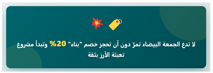 إذا كنت مقبلاً على إعداد دراسة جدوى مشروع تعبئة الأرز في السعودية؛ فاحرص على استغلال خصومات الجمعة البيضاء من ” بناء ” لتحصل على الدراسة بخصم مميز يصل إلى 20% محققًا مشروعك بأقل تكلفة استثمارية ممكنة، ولتستفيد من العرض؛ اتبع الخطوات التالية: