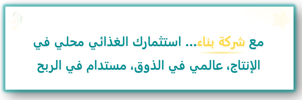 الفرص الاستثمارية في ” بناء ” لم تنتهي بعد؛ يمكنك التواصل مع فريق عملنا والتعرف على المزيد والمزيد حول أفضل المشاريع الغذائية الناجحة في السوق السعودي بالوقت الحالي