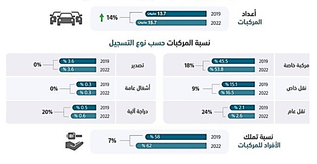 بشكل عام بلغت نسبة تملك الأفراد للمركبات في 2019 معدل 58%. وارتفع المعدل في 2022 إلى 62% بزيادة بنسبة 7%.