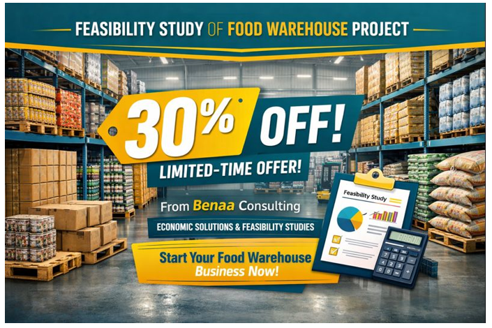 من اليوم ومع بداية العام الجديد 2026 يمكنك الحصول على دراسة جدوى مشروع مستودع مواد غذائية بخصم حصري من شركة ” بناء ” يصل إلى 30%، ويشمل الخصم جميع الخدمات بالشركة من دراسات الجدوى المعتمدة، والخدمات الاستشارية، وكذلك خدمات دراسة وتحليل المخاطر، وخدمات مشروعات الدمج والاستحواذ وغير ذلك الكثير لنضمن لك نجاح اقتصادي مبهر بين المنافسين.